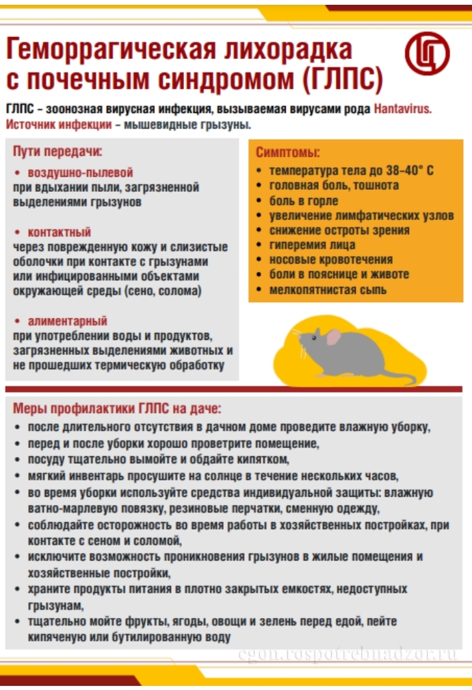 Геморрагическая лихорадка с почечным синдромом (ГЛПС) – острое инфекционное заболевание с поражением почек и кровеносных сосудов, выраженной интоксикацией, характерна весенне-летне-осенняя сезонность. Источниками хантавирусов являются грызуны. Инкубационный период при ГЛПС составляет от 4 до 49 дней (чаще 2-3 недели). Заражение инфекцией происходит: воздушно-пылевым путем – вирус в организм человека проникает через дыхательные пути вместе с пылью. Это может произойти в начале дачного сезона при уборке дачного домика, во время «сухой» уборки (подметания) в помещениях, заселенных грызунами, без соблюдения мер защиты, во время сельскохозяйственных работ, связанных с пылеобразованием на дачных участках, либо в быту при уборке сараев, гаражей; алиментарным путем – вирус попадает в организм при употреблении в пищу продуктов, питьевой воды, зараженной выделениями грызунов; контактным путем – вирус проникает через слизистые оболочки или поврежденную кожу при непосредственном соприкосновении с грызунами и предметами, загрязненными их выделениями. Клинические проявления ГЛПС обусловлены поражением почек. Острое начало болезни: резкое повышение температуры до 38–40 °C, головная боль, озноб, тошнота, ломота во всём теле; чуть позже присоединяются боли в пояснице и животе; боли в глазных яблоках и снижение остроты зрения (туман перед глазами, «мушки»). Больной человек не опасен для окружающих, так как не является источником инфекции! При появлении признаков заболевания после проведения работ, связанных с пылеобразованием, обратитесь за медицинской помощью и сообщите о фактах возможного контакта с мышевидными грызунами. В целях предупреждения заболевания необходимо обеспечить проведение комплекса профилактических мероприятий: в квартирах и частных домах осуществляйте своевременный ремонт дверных, оконных проемов, мест прохождения коммуникаций в стенах, перекрытиях, ограждений; храните пищевые продукты в недоступных для грызунов местах, в герметичных емкостях, не употребляйте в пищу поврежденные грызунами продукты; не принимайте пищу немытыми руками; не употребляйте некипяченую воду из открытых водоисточников; при появлении грызунов в городских и сельских строениях обращайтесь в специализированные организации для проведения дератизации; Основным способом предупреждения заболевания является борьба с грызунами, а также меры, направленные на предохранение от контакта с ними или их выделениями